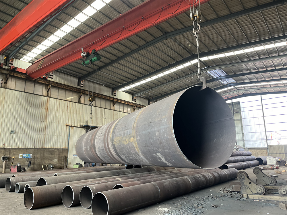 ①卷板成型的钢管在每段焊接完毕后,需上机‘校圆’,在弧度偏小的部位往复滚卷,去除内应力,提高钢管圆度。
